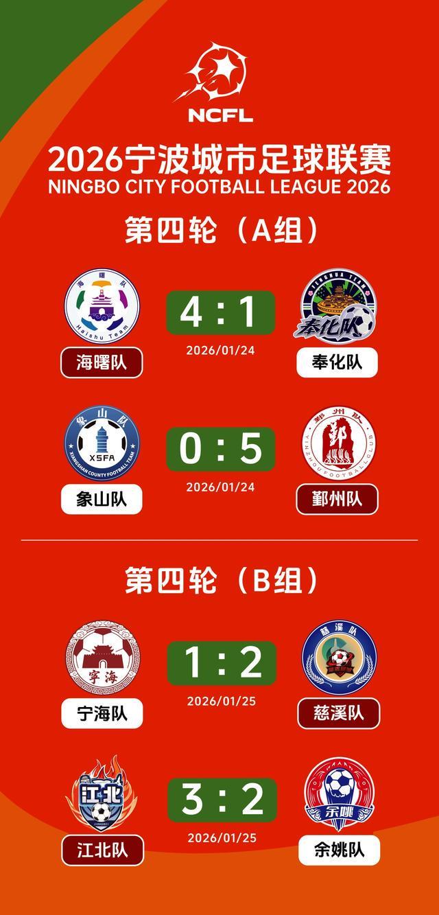 1月25日下午,2026宁波城市足球联赛完成第四轮B组的两场争夺:江北队主场3比2战胜余姚队后,以两胜两平的战绩率先从B组出线;慈溪队2比1战胜宁海队,慈溪队最后一轮只要不输球即可出线。